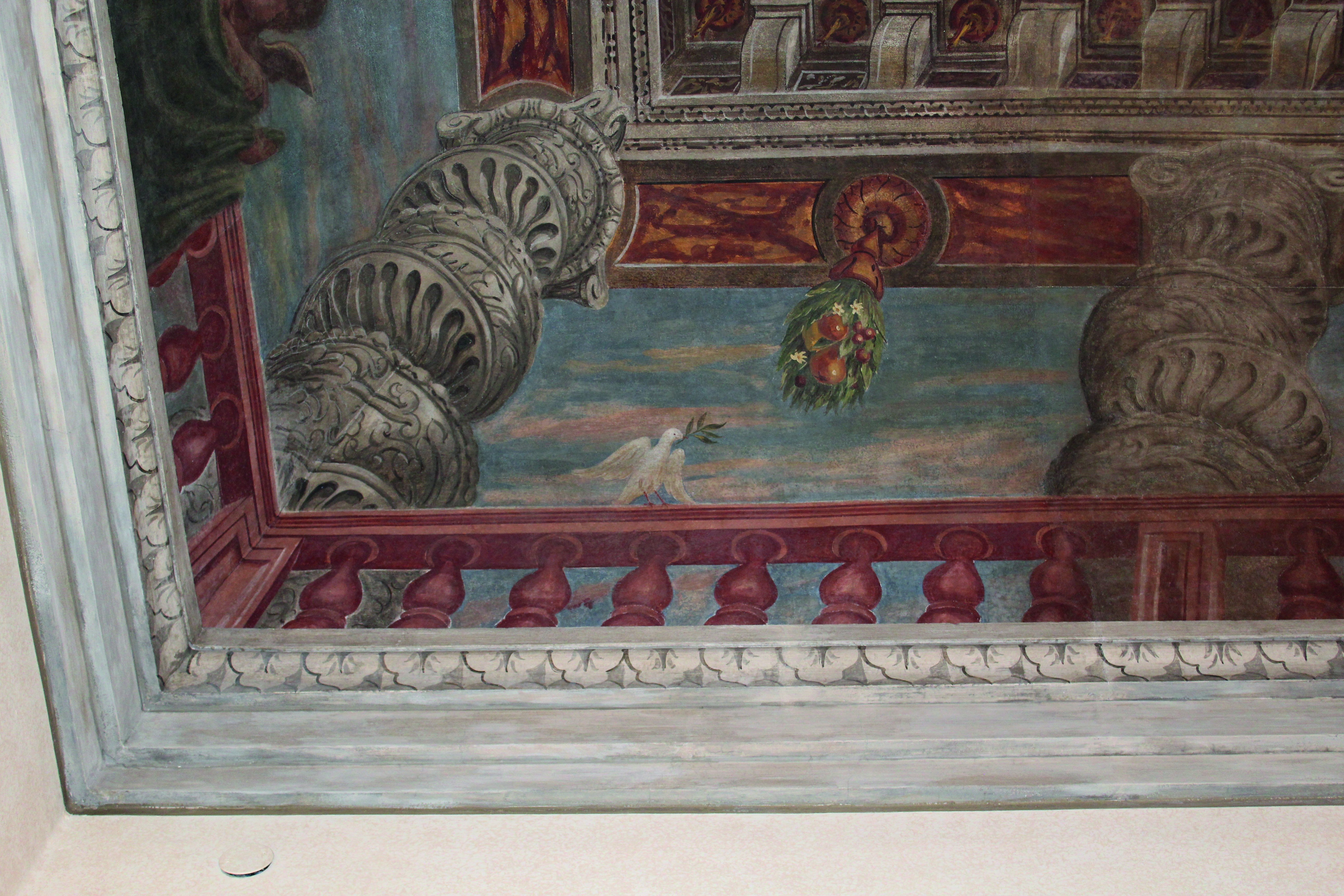Una bianca colomba regge nel becco un ramoscello d’ulivo, simbolo di Pace. Nella Sala del Tronetto in Palazzo Vescovile, è l’unico elemento figurativo riferibile al XX secolo in una composizione delineata nel XVII per la Canonica degli Eremitani a Padova. Gli affreschi sono stati lì trasportati durante la ricostruzione del Palazzo dopo la seconda guerra mondiale. Si veniva da una guerra disastrosa ma, dopo le bombe, dopo i morti, dopo la devastazione, è tempo di pace.