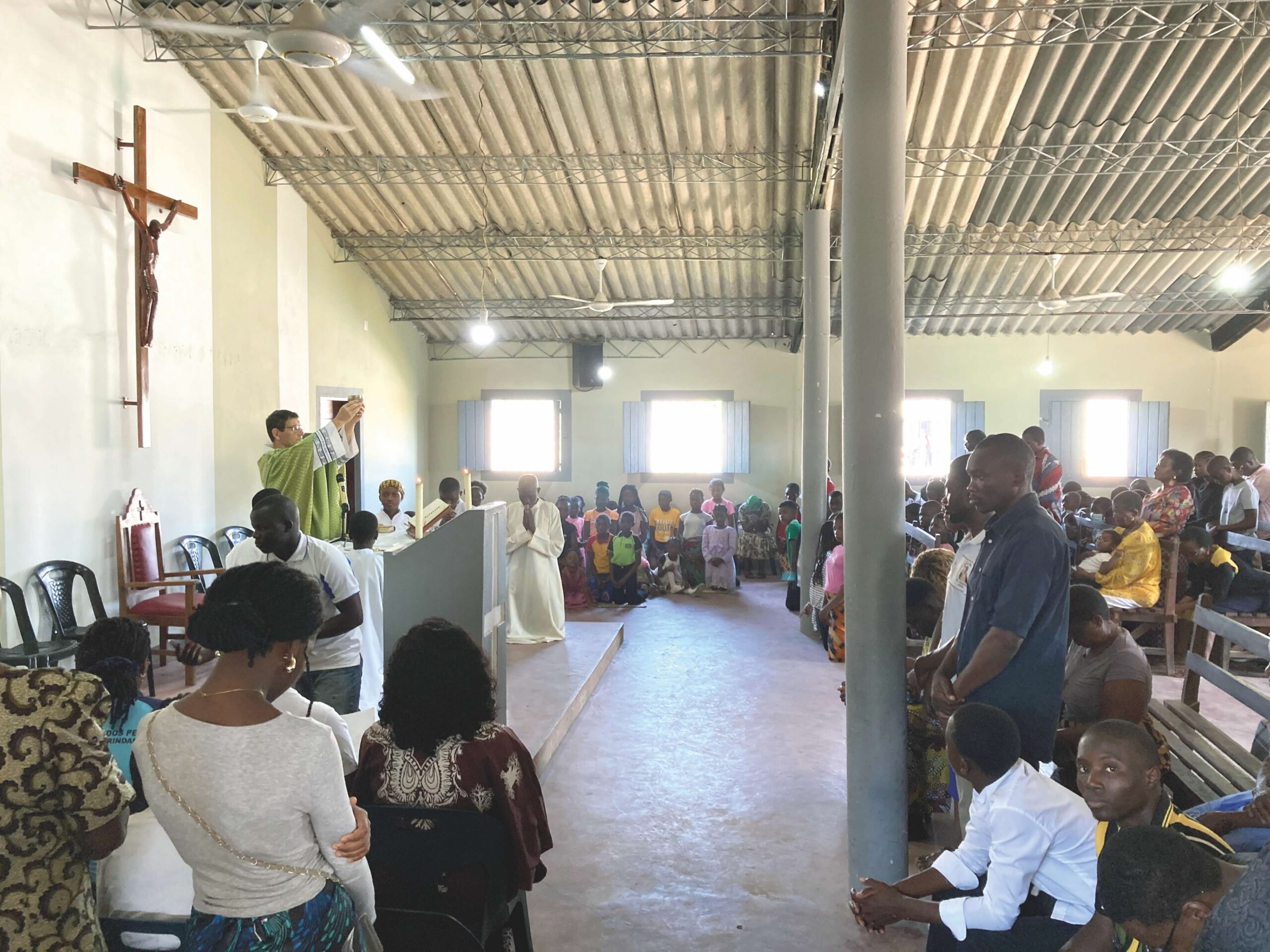 Nuove chiese sono anche quelle delle parrocchie dei Santi Angeli Custodi e di Ognissanti, realizzate dopo il ciclone Idai che nel 2019 ha distrutto e allagato la città, le prime chiese cattoliche consacrate a Beira da quando il Mozambico ha ottenuto l’indipendenza, nel 1975. La chiesa dei Santi Angeli Custodi è la parrocchia dell’aeroporto di Beira. Un buon viatico per i passeggeri che giungono e partono dal Mozambico. La visitiamo di sabato pomeriggio, durante un momento speciale: si stanno svolgendo gli esami di fine anno del catechismo. Un centinaio di bambini e bambine divisi in gruppi, con età che vanno dagli 8 ai 12 anni, rispondono alle domande su un foglio e poi vengono interrogati dai loro catechisti. Non c’è tensione o preoccupazione. Finché aspettano i bambini scherzano e sorridono ma vivono questo passaggio con impegno e serietà. Lo stesso impegno che mettono nel canto. Il giorno dopo, domenica, partecipiamo alla Messa nella parrocchia di Santa Croce. La celebrazione inizia alle 7.30. Tutti (o quasi) si presentano puntuali, una donna si occupa dell’accoglienza e accompagna le persone a sedersi. Una ventina di bambini siedono su alcune stuoie a fianco del presbiterio. Ogni tanto qualcuno di loro si alza ed esce, si prende una pausa e poi rientra. Anche loro sono accompagnati a vivere la celebrazione da una donna che fa loro segno quando è il momento di alzarsi e sedersi. La partecipazione è totale.